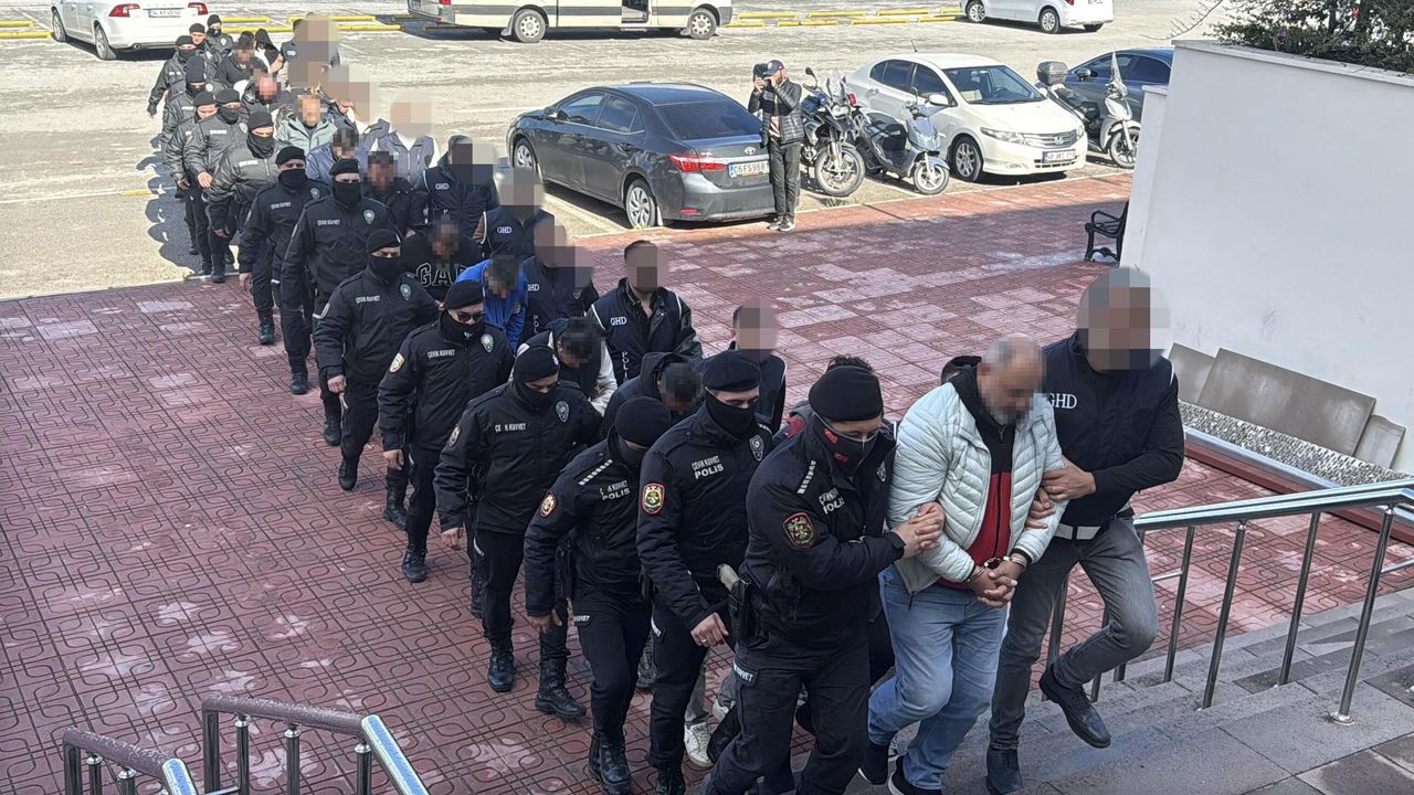 İşlemleri tamamlanan 16 şüpheli bugün sabah saatlerinde yoğun güvenlik önlemi altında adliyeye sevk edildi