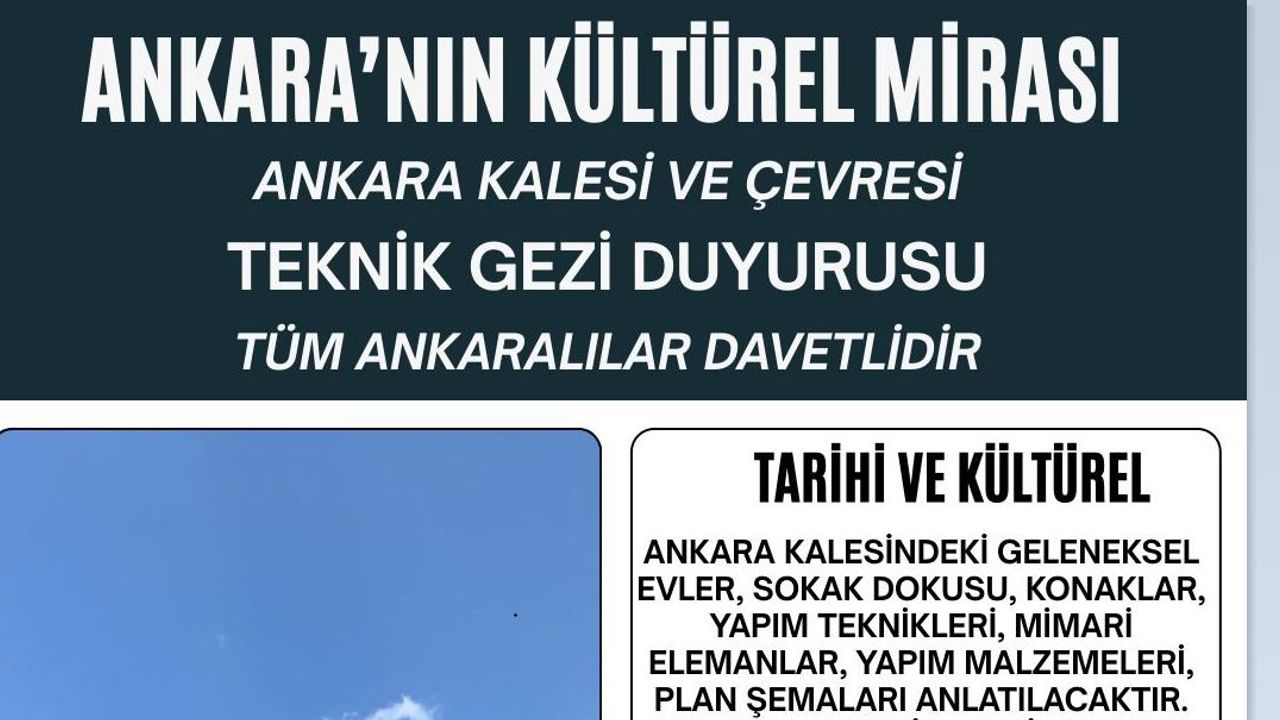 Ankara Kent Konseyi Tarihi Kentler Etkileşim Çalışma Grubu, “Ankara'nın Kültürel Mirası: Ankara Kalesi ve Çevresi Teknik Gezisi”ni Ankaralılarla buluşturuyor. Mimar Faruk Soydemir’in anlatımıyla gerçekleşecek gezide, Başkent’in en önemli tarihî bölgelerinden biri olan Ankara Kalesi’nin mimari ve kültürel yapısı detaylarıyla ele alınacak.