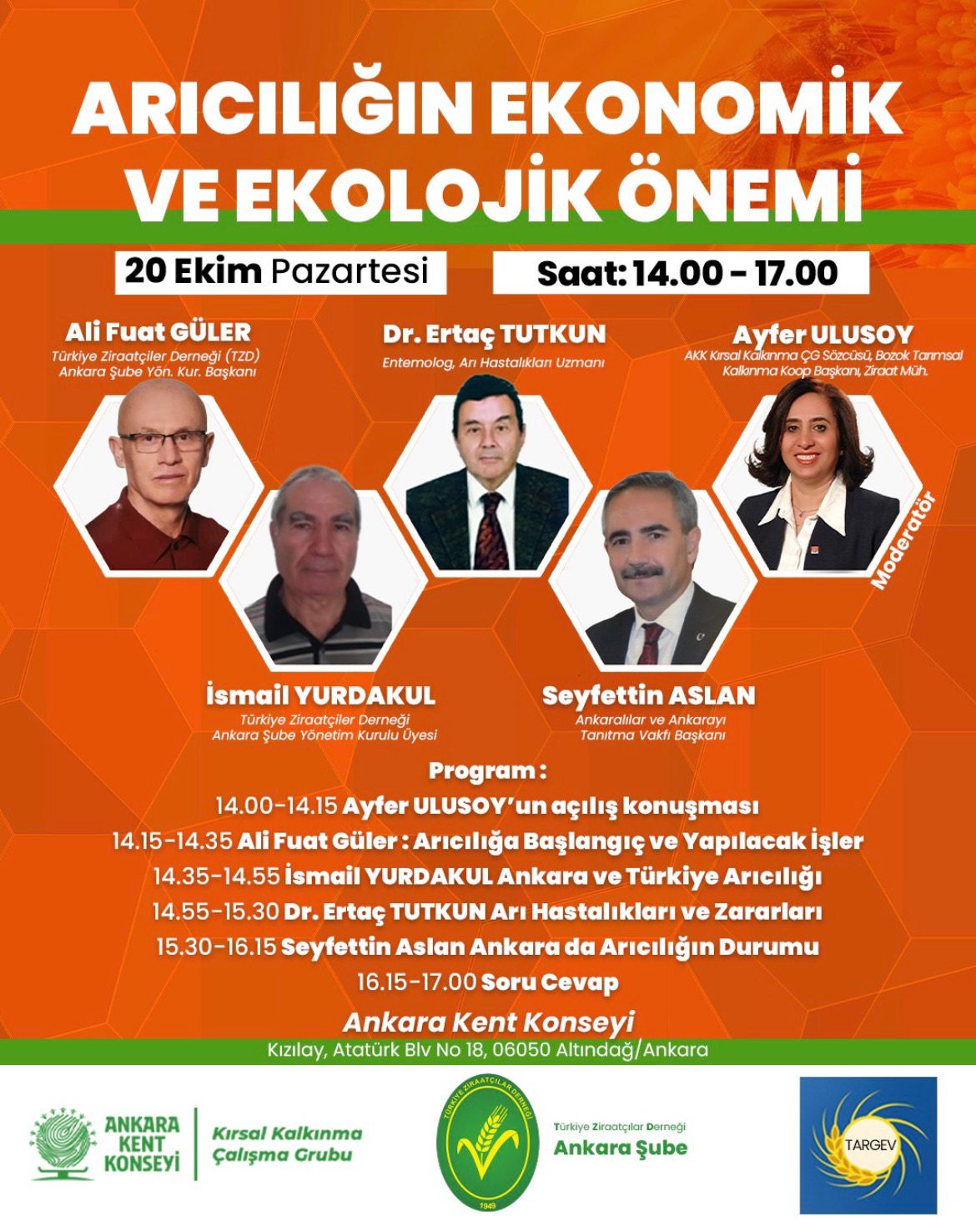 Ankara Kent Konseyi Kırsal Kalkınma Çalışma Grubu, Türkiye Ziraatçiler Derneği (TZD) Ankara Şubesi ve TARGEV iş birliğiyle düzenlenen “Arıcılığın Ekonomik ve Ekolojik Önemi” başlıklı panel, bugün (20 Ekim Pazartesi) saat 14.00–17.00 arasında gerçekleştirilecek. Etkinlik, Kızılay Atatürk Bulvarı No:18 adresindeki Ankara Kent Konseyi binasında yapılacak.