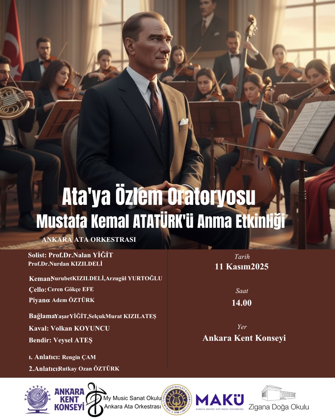 Ankara Kent Konseyi, Ankara Üniversitesi Devlet Konservatuvarı, Burdur Mehmet Akif Ersoy Üniversitesi, Zigana Doğa Okulu ve My Music Sanat Okulu iş birliğiyle “Ata’ya Özlem Oratoryosu” düzenleyecek. Etkinlik, Cumhuriyetimizin kurucusu Gazi Mustafa Kemal Atatürk’ü sevgi, saygı ve özlemle anmak amacıyla gerçekleştirilecek.