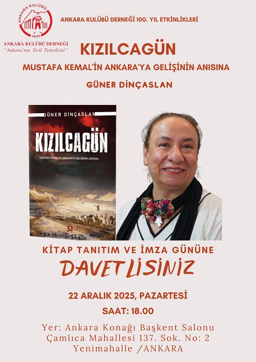 Ankara Kulübü Derneği, Cumhuriyet tarihinin simge anlarından biri olan Mustafa Kemal Atatürk’ün Ankara’ya gelişini konu alan Kızılca Gün kitabını, özel bir etkinlikle Ankaralıların ilgisine sunuyor. Yazar Güner Dinçaslan’ın kaleme aldığı eser, dönemin tarihsel atmosferini edebi bir anlatımla ele alıyor.