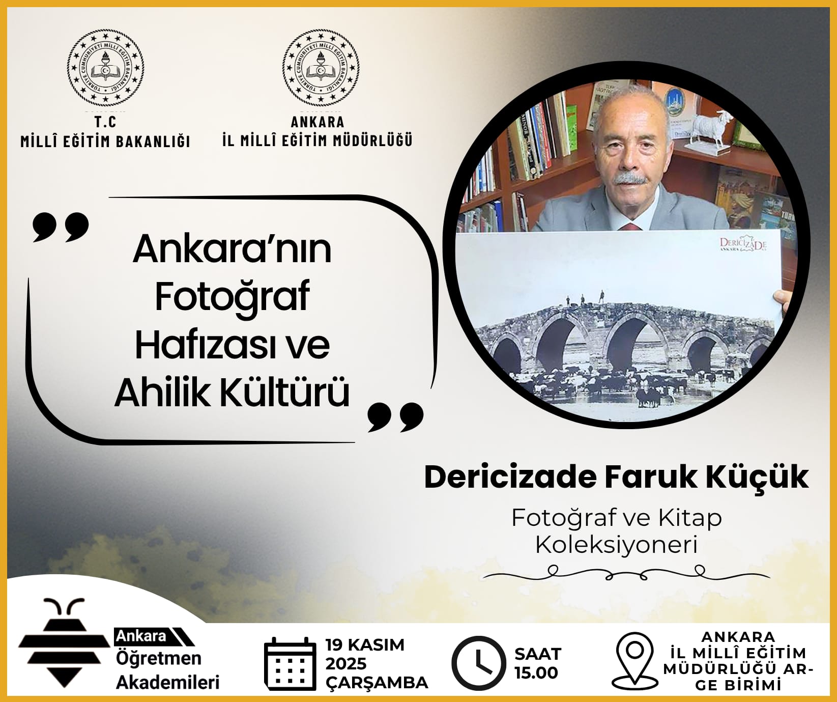 T.C. Millî Eğitim Bakanlığı ve Ankara İl Millî Eğitim Müdürlüğü’nün ortaklaşa yürüttüğü Ankara Öğretmen Akademileri programı, kentin kültürel hafızasını yaşatmayı sürdürüyor. Bu kapsamda fotoğraf ve kitap koleksiyonerı Dericizade Faruk Küçük, “Ankara’nın Fotoğraf Hafızası ve Ahilik Kültürü” temalı bir sunum gerçekleştirecek.