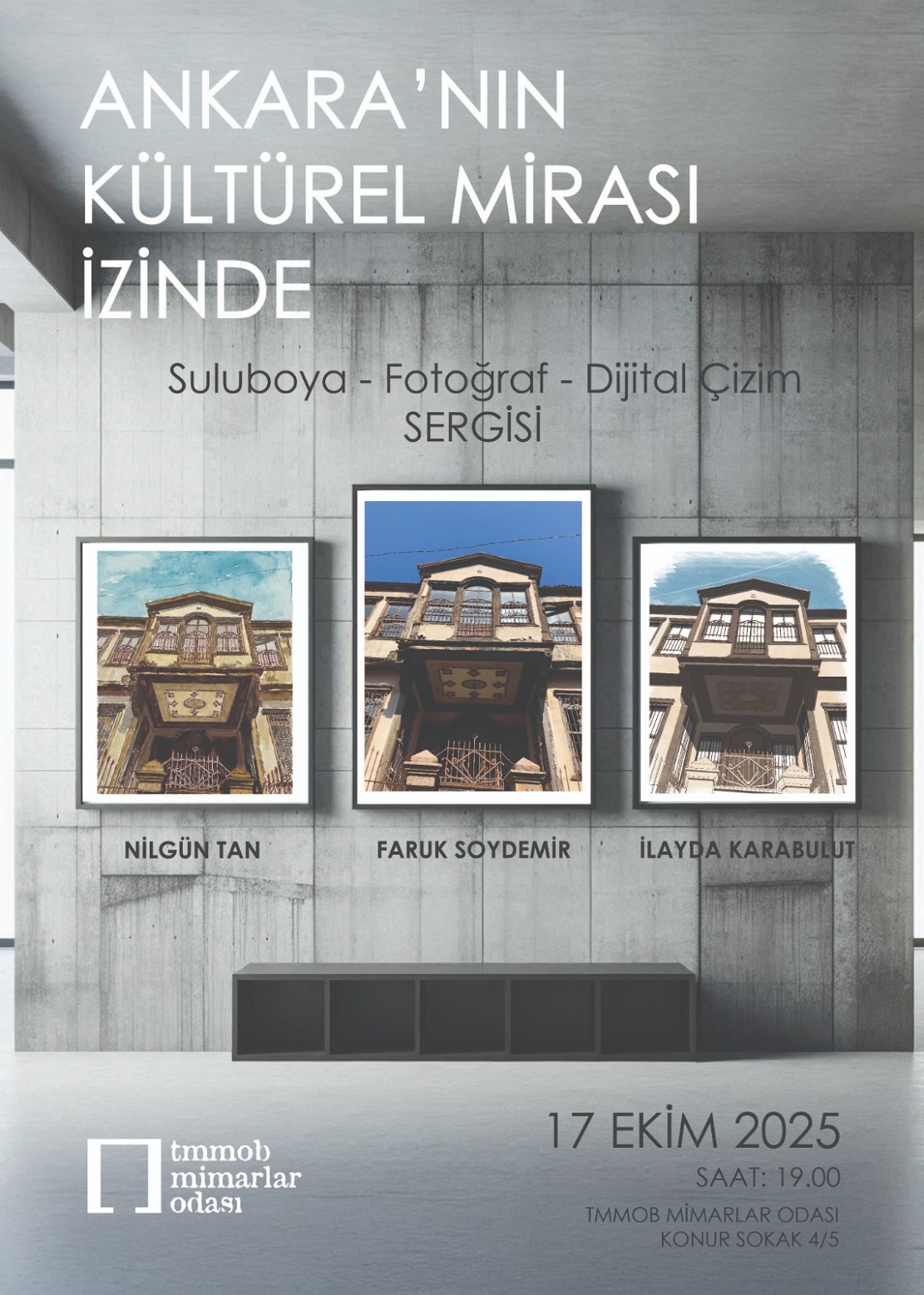 Ankara’nın mimari mirasını farklı sanat disiplinleriyle ele alan “Ankara’nın Kültürel Mirası İzinde” adlı sergi, 17 Ekim 2025’te sanatseverlerle buluşacak. Sulu boya, fotoğraf ve dijital çizimlerden oluşan sergide; Nilgün Tan, Faruk Soydemir ve İlayda Karabulut eserleriyle yer alacak.
