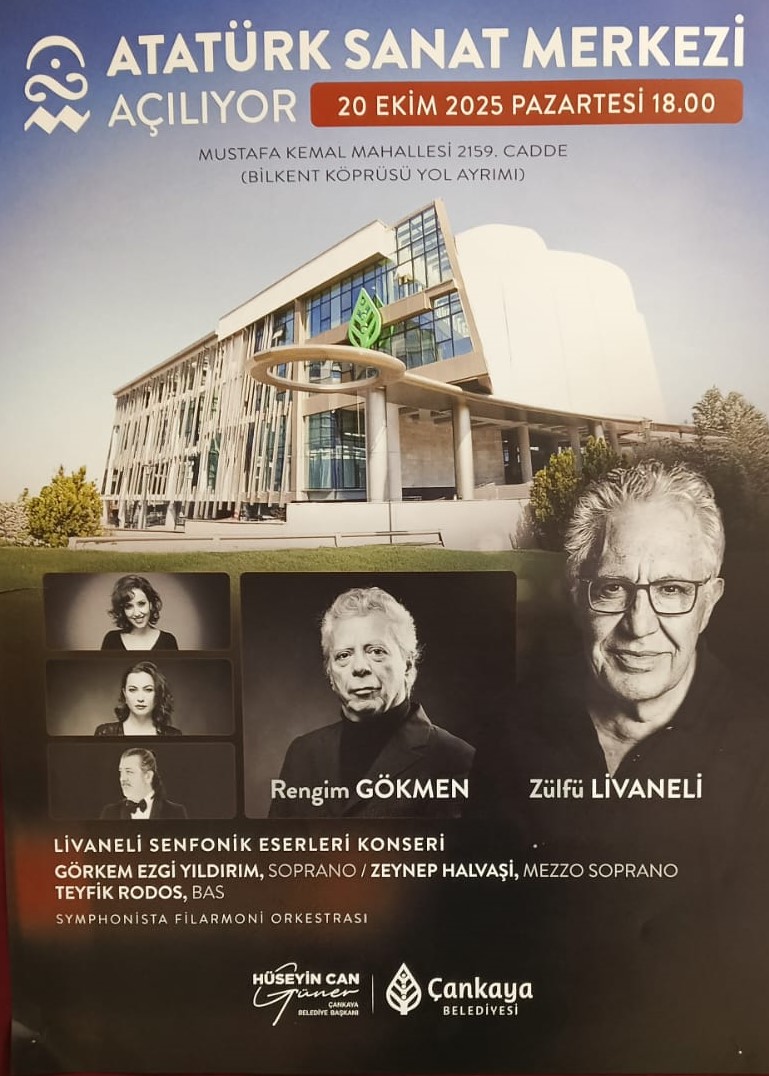 Çankaya Belediyesi tarafından hayata geçirilen Atatürk Sanat Merkezi, 20 Ekim 2025 Pazartesi günü saat 18.00’de kapılarını sanatseverlere açıyor. Açılışta Rengim Gökmen yönetiminde, Zülfü Livaneli’nin senfonik eserlerinden oluşan özel bir konser düzenlenecek.