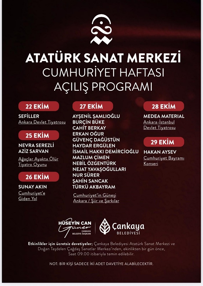 Tüm etkinliklerin ücretsiz davetiyeleri, belirtilen tarihlerde Atatürk Sanat Merkezi ve Çağdaş Sanatlar Merkezi’nden temin edilebilecek.