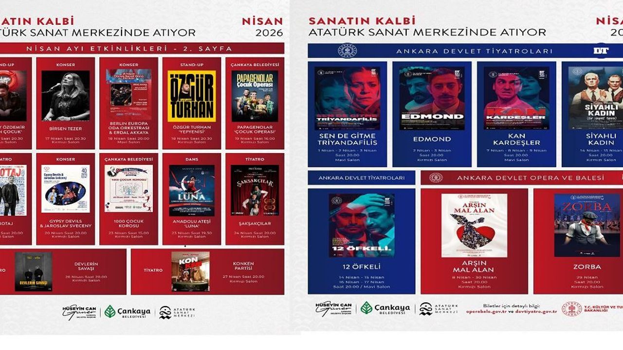 Atatürk Sanat Merkezi ile Başkent’in sanat yaşamına önemli bir katkı sunan Çankaya Belediyesi, nisan ayında da dopdolu bir etkinlik takvimiyle sanatseverleri buluşturuyor. Tiyatro, opera, konser ve stand-up gösterilerinin yer aldığı program, sanatın farklı dallarını aynı sahnede bir araya getiriyor.