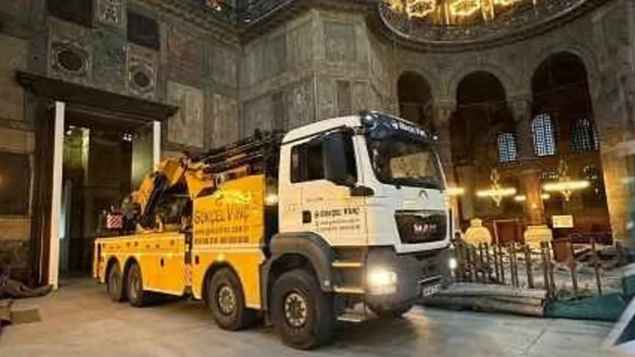 Cumhurbaşkanı Recep Tayyip Erdoğan'ın talimatıyla müzeden camiye çevrilen Ayasofya'da restorasyon çalışmaları sürüyor. Restorasyon çalışmaları kapsamında bin 500 yıllık tarihi olan Ayasofya'ya yüksek tonajlı kamyonlar sokuldu.