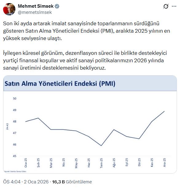 Hazine ve Maliye Bakanı Mehmet Şimşek, "Son iki ayda artarak imalat sanayisinde toparlanmanın sürdüğünü gösteren satın alma yöneticileri endeksi (PMI) aralıkta 2025 yılının en yüksek seviyesine ulaştı" dedi.