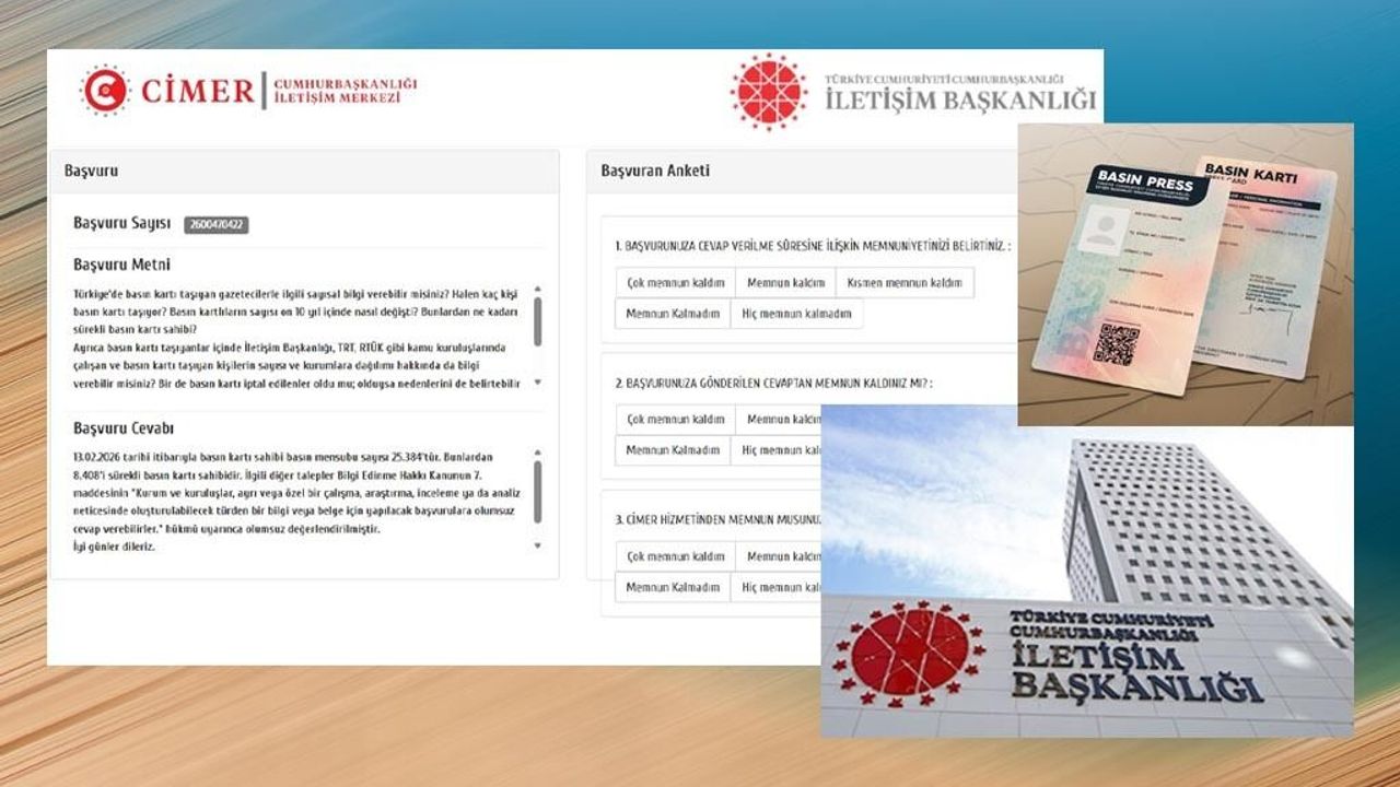 CİMER aracılığıyla İletişim Başkanlığı’na başvurdum. “Basın kartlıların sayısını, bu sayının son 10 yıl içindeki değişimini, İletişim Başkanlığı, TRT, RTÜK gibi kamu kuruluşlarında çalışan basın kartlıların sayısını, bu kişilerin kurumlara dağılımını” sordum.