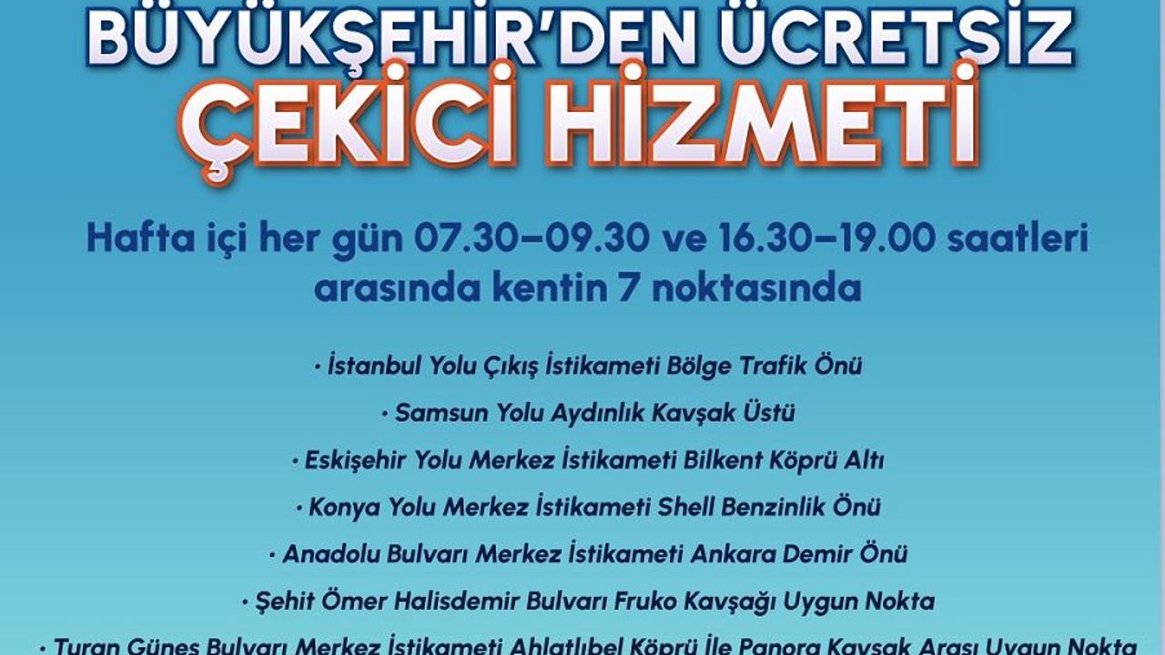 İl Emniyet Müdürlüğü Trafik Denetleme Şube Müdürlüğü ile yapılan koordinasyon sonucunda belirlenen 7 noktada, Fen İşleri Daire Başkanlığı’na ait kayar kasalı çekiciler görev yapacak. Yoğun ilgi gören hizmet, 19 Kasım 2025’ten itibaren hafta içi her sabah 07.30-09.30 ile akşam 16.30-19.00 saatleri arasında sürücülere ücretsiz olarak sunulacak.