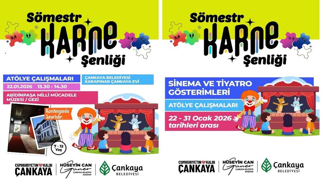 Çankaya Belediyesi, yarıyıl tatilini verimli ve keyifli geçirmek isteyen çocuklar için dopdolu bir kültür ve sanat programını hayata geçiriyor. “Sömestr Karne Şenliği” kapsamında iki hafta boyunca tiyatro oyunları, film gösterimleri ve çocuklara özel sanat atölyeleri düzenlenecek.