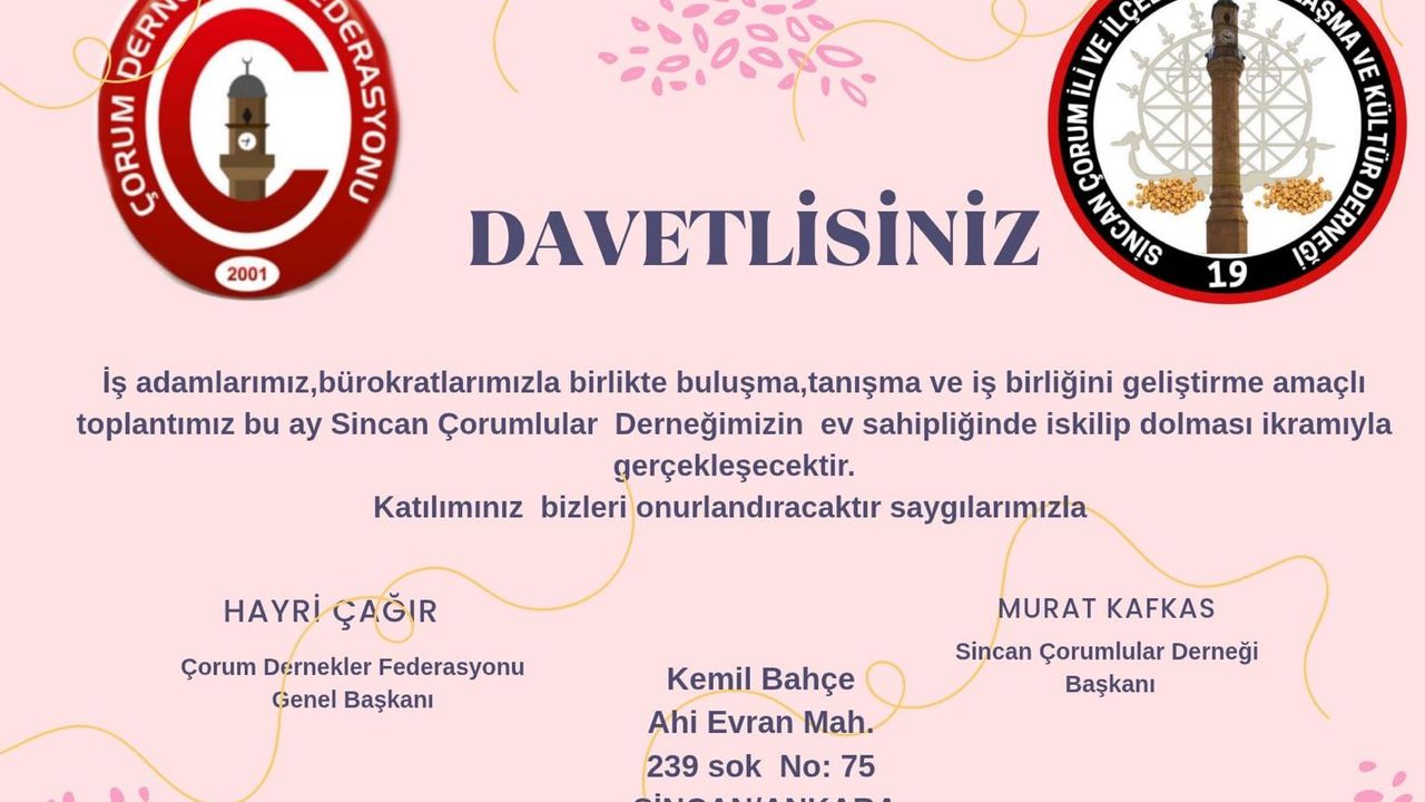 Çorum Dernekler Federasyonu tarafından her ay geleneksel olarak düzenlenen buluşma toplantısının bu ayki durağı Sincan oluyor. Çorum Dernekler Federasyonu Genel Başkanı Hayri Çağır ve Sincan Çorumlular Derneği Başkanı Murat Kafkas’ın ev sahipliğinde düzenlenecek toplantı, iş insanları ile bürokratları bir araya getirecek.