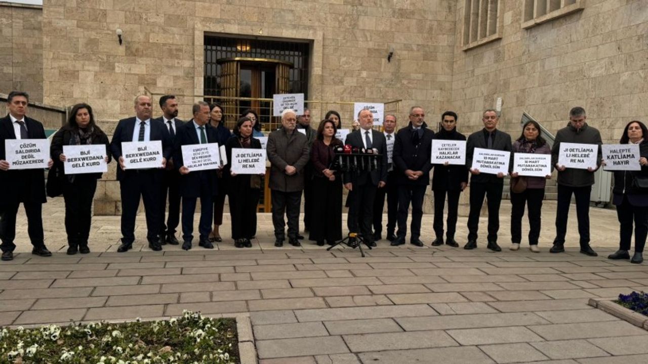 Halkların Eşitlik ve Demokrasi Partisi (DEM Parti) Meclis Grubu, Suriye’deki geçici hükümetin Halep’te Kürtlerin yoğun olarak yaşadığı Şeyh Maksud ve Eşrefiye mahallelerine yönelik saldırılarını protesto etmek amacıyla Türkiye Büyük Millet Meclisi Basın Kapısı önünde basın açıklaması gerçekleştirdi.