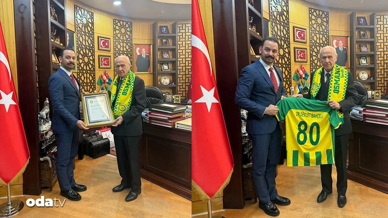 Osmaniyespor Kulübü Başkanı Mahmut Altay Kobaner, MHP Genel Başkanı Devlet Bahçeli'yi makamında ziyaret etti. Bahçeli’ye kulübün 'Onursal Başkanlık Belgesi'ni takdim eden Kobaner, takımın forma ve atkısını da hediye etti. Osmaniyespor formasını giyen Bahçeli, hatıra fotoğrafı çektirdi.