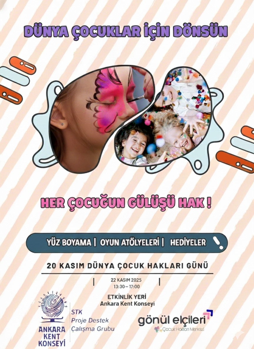 Ankara Kent Konseyi STK Proje Destek Çalışma Grubu ile Gönül Elçileri Çocuk Hakları Merkezi iş birliğiyle, 20 Kasım Dünya Çocuk Hakları Günü kapsamında bugün “Dünya Çocuklar İçin Dönsün” programı düzenlenecek.