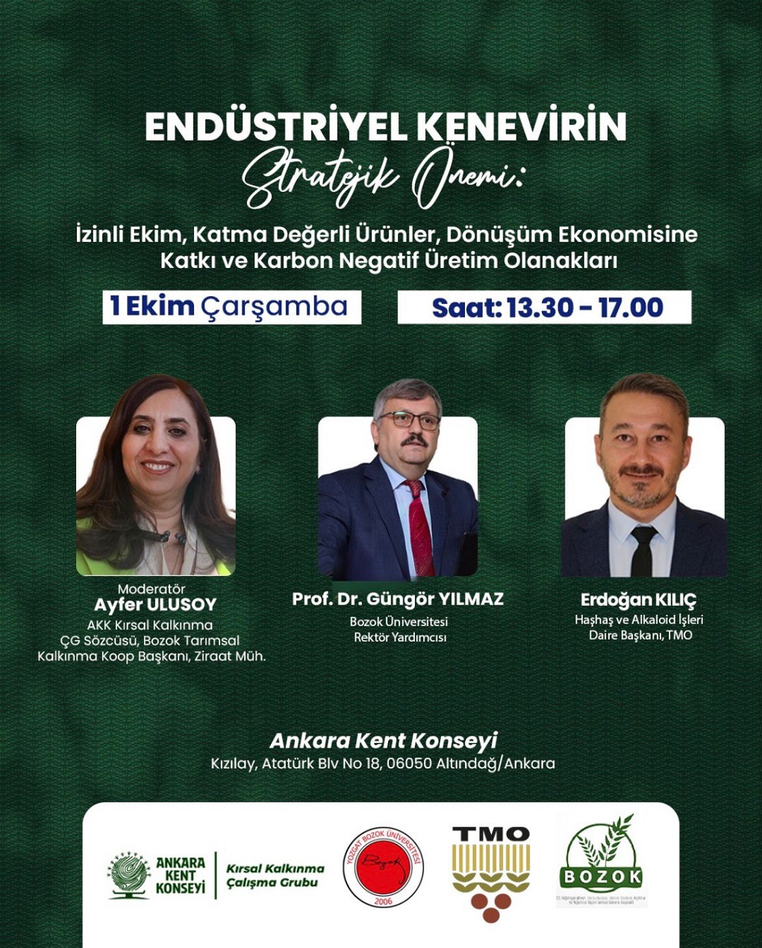 Ankara Kent Konseyi Kırsal Kalkınma Çalışma Grubu, Yozgat Bozok Üniversitesi, Toprak Mahsulleri Ofisi ve Bozok Tarımsal Kalkınma Kooperatifi iş birliğiyle “Endüstriyel Kenevirin Stratejik Önemi: İzinli Ekim, Katma Değerli Ürünler, Dönüşüm Ekonomisine Katkı ve Karbon Negatif Üretim Olanakları” başlıklı program düzenleniyor.
