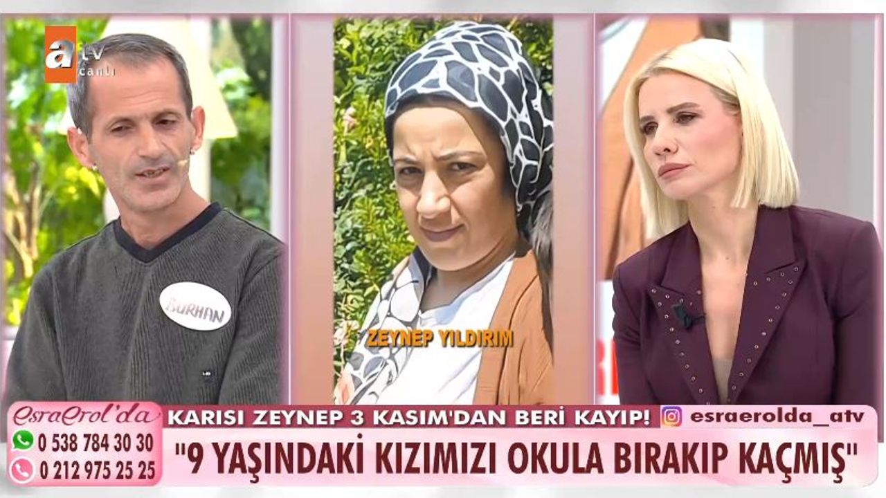 Burhan Yıldırım, eşi Zeynep Yıldırım’ın 9 yaşındaki kızlarını okula bıraktıktan sonra siyah bir araca binerek kayıplara karıştığını belirterek Esra Erol’un programına katıldı. Burhan Yıldırım, eşinin birkaç gün önce kendisini arayarak gelmek istediğini ancak korktuğu için gelemeyeceğini söylediğini aktardı. Kendisi ise eşine İstanbul’dan Muğla’ya gelmesi için bilet almasına rağmen, Zeynep Yıldırım’ın belirtilen tarihte gelmediğini ve kendisinden bir daha haber alamadığını ifade etti. Dört çocuk sahibi olduklarını belirten Burhan Yıldırım, eşinin son zamanlarda telefonda yabancı biriyle konuştuğunu fark ettiğini ve bu nedenle eşinin kendisini aldattığını düşündüğünü söyledi. Canlı yayına bağlanan Zeynep Yıldırım ise, eşine Esra Erol’a çıktığı için kızdığını ve kendilerini rezil ettiklerini belirterek, bir daha eve dönmeyeceğini ve evi terk ettiğini söyledi. Esra Erol’un “Dört çocuğunuzu neden terk ettiniz?” sorusuna ise cevap vermedi.