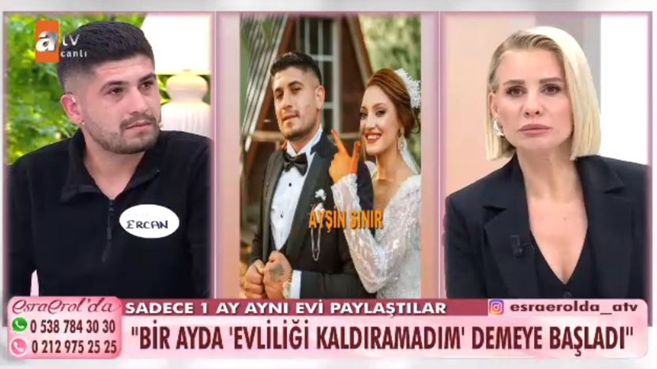 Düzce’den programa katılan Ercan Sınır, eşinin bir ay içinde tüm altınlarını ve evdeki değerli eşyaları alarak ortadan kaybolduğunu belirterek Esra Erol’a başvurdu. 24 yaşındaki Ercan Sınır, bir ay önce evlendiği Ayşin Sınır’ın ailesinin etkisinde kalarak kendisini terk ettiğini düşündüğünü söyledi. Programa annesi Ayşe Hanım ile birlikte katılan Sınır, eşinin evden ayrılırken para edebilecek tüm eşyaları aldığını ve kendisini mağdur ettiğini öne sürdü. Eşine neden gittiğini sorduğunda ise “Ben evliliği kaldıramıyorum” yanıtını aldığını ifade etti.