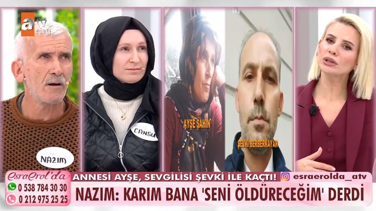 Nazım Bey, üvey kızı Cansu ile birlikte eşi Ayşe Şahin’in bulunması için Esra Erol’un programına başvurdu. 11 Aralık tarihinden bu yana kayıp olan Ayşe Şahin’in, sevgilisi olduğu iddia edilen Şevki Berberkaya ile birlikte olduğu düşünülüyor. Cansu Hanım, annesinin evde olduğu dönemlerde sürekli olarak telefonla fısıltı halinde birileriyle konuştuğunu ve bunu gizlemeye çalıştığını belirterek bu durumdan şüphelendiklerini söyledi. Kiminle konuştuğunu sorduklarında ise annesinden “Karışmayın bana” şeklinde yanıt aldıklarını ifade etti.