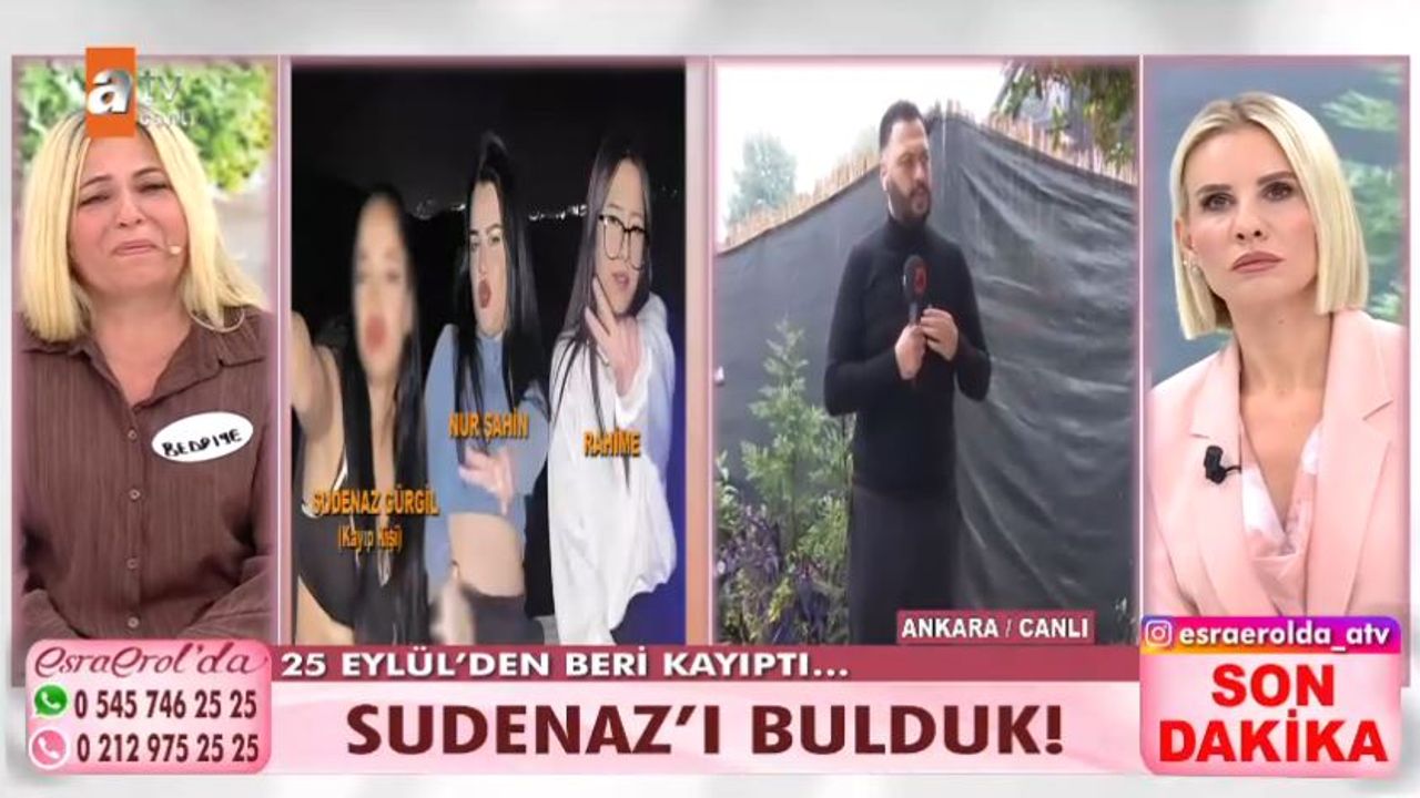 25 eylül tarihinde Ankara’da kaybolan Sudenaz Gürgil annesi Bedriye hanım tarafından aranmaya devam ediyor. 17 yaşındaki sudenaz’ın 3 yıldır madde kulandığı ve 17 adet suç kaydının olduğu biliniyor. Kendisinin kötü niyetli arkadaşlarının etkisi altında olduğu biliniyor. 2 gündür esra erol ve ekip arkadaşları tarafından aranan 17 yaşındaki sudenaz esra erol tarafından bulundu. Canlı yayında Esra Erol ve ekip arkadaşları tarafından bulunan sudenaz canlı yayına çıkmadan önce sinir krizi geçirerek canlı yayına çıkmak istemediğini ifade etti.