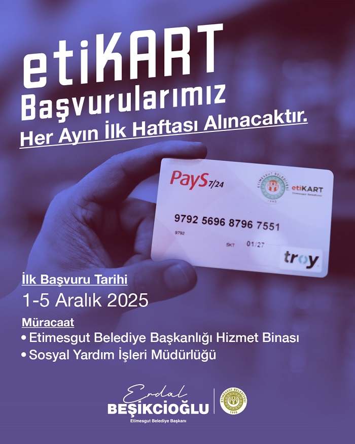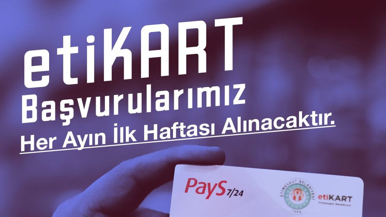 etiKART desteğinden yararlanmak isteyen vatandaşlar, Etimesgut Belediye Başkanlığı Hizmet Binası Sosyal Yardım İşleri Müdürlüğü’ne başvuruda bulunabilecek.