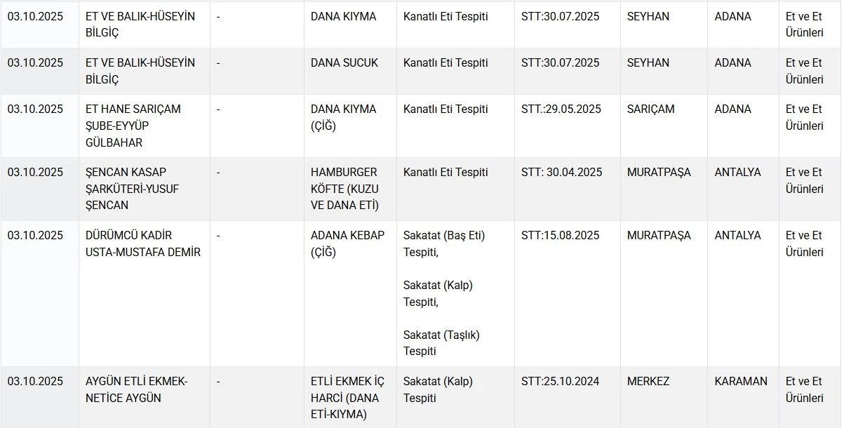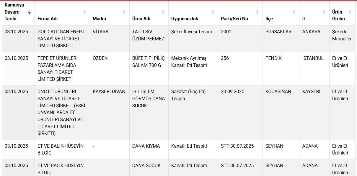 Listeye 2'si sağlığı tehlikeye düşürecek ürün olmak üzere toplam 22 yeni ürün daha eklendi. Listede zeytinyağı, bal, kıyma ve sucuk gibi ürünler yer aldı.
