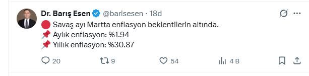“Savaş ayı Martta enflasyon beklentilerin altında. Aylık enflasyon: %1.94. Yıllık enflasyon: %30.87”