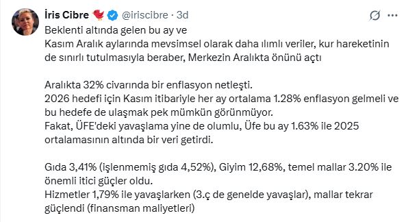 “Beklenti altında gelen bu ay ve Kasım Aralık aylarında mevsimsel olarak daha ılımlı veriler, kur hareketinin de sınırlı tutulmasıyla beraber, Merkezin Aralıkta önünü açtı Aralıkta 32% civarında bir enflasyon netleşti. 2026 hedefi için Kasım itibariyle her ay ortalama 1.28% enflasyon gelmeli ve bu hedefe de ulaşmak pek mümkün görünmüyor. Fakat, ÜFE'deki yavaşlama yine de olumlu, Üfe bu ay 1.63% ile 2025 ortalamasının altında bir veri getirdi. Gıda 3,41% (işlenmemiş gıda 4,52%), Giyim 12,68%, temel mallar 3.20% ile önemli itici güçler oldu. Hizmetler 1,79% ile yavaşlarken (3.ç de genelde yavaşlar), mallar tekrar güçlendi (finansman maliyetleri)”