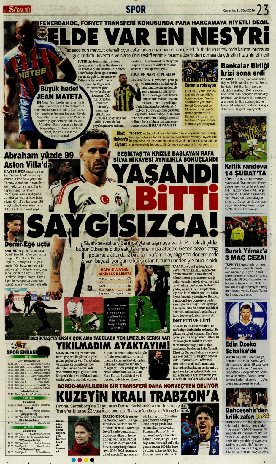 Spor manşetlerinde öne çıkan gelişmeler, transfer iddiaları, bahis skandalı ve Beşiktaş, Fenerbahçe, Galatasaray ile Trabzonspor’un gündemine 1 dakikada göz atın. İşte gazetelerin spor manşetleri…