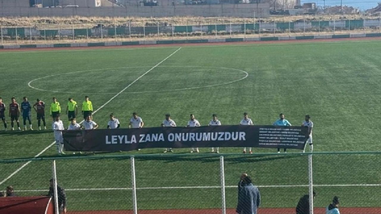 Van’da Erciş Örene Spor ile İpekyolu Belediye Gençlikspor arasında oynanan karşılaşma, futbolcuların sahaya “Leyla Zana onurumuzdur” yazılı pankartla çıkmasıyla dikkat çekti.