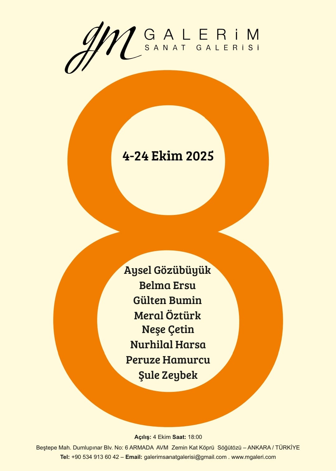 Ankara’nın önemli sanat mekânlarından Galerim Sanat Galerisi, sekiz kadın sanatçının eserlerini bir araya getiren özel bir sergiye ev sahipliği yapıyor. 4-24 Ekim 2025 tarihleri arasında açık kalacak sergi, çağdaş sanatın farklı yorumlarını sanatseverlerle buluşturacak.