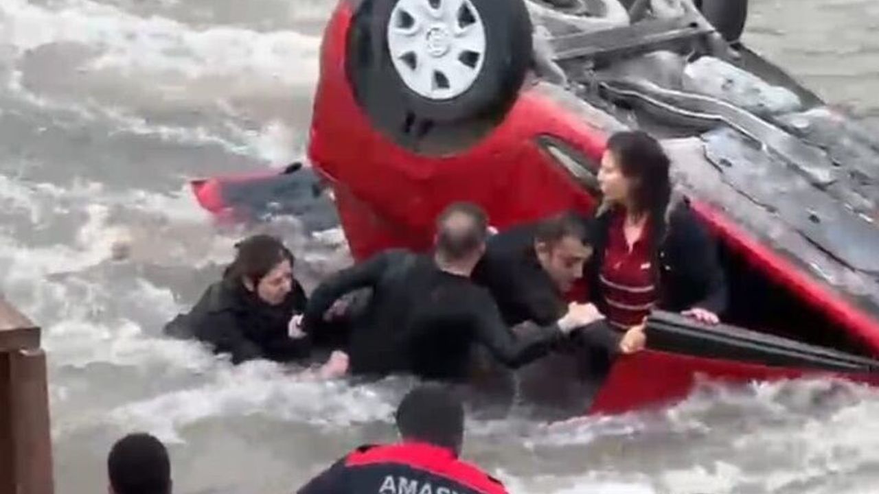 Çarpışmanın etkisiyle savrulan otomobil, köprünün demir korkuluklarını kırarak Yeşilırmak'a uçtu. Nehirde 50 metreden fazla sürüklenen otomobil, ters döndü. Çevredekilerin ihbarı ile kaza yerine Amasya Belediyesi İtfaiye Sualtı Kurtarma ekipleri, polis, AFAD ve sağlık ekipleri sevk edildi. Ekiplerin çalışması sonucu sürücü Nehir Kamışlı ile yanındaki annesi Hanife Kamışlı, araçtan yaralı olarak çıkarıldı. Yaralı anne-kız, ambulanslarla Amasya Sabuncuoğlu Şerefeddin Eğitim ve Araştırma Hastanesi'ne kaldırıldı. Yaralıların durumlarının iyi olduğu belirtildi. Kazayla ilgili soruşturma başlatıldı.