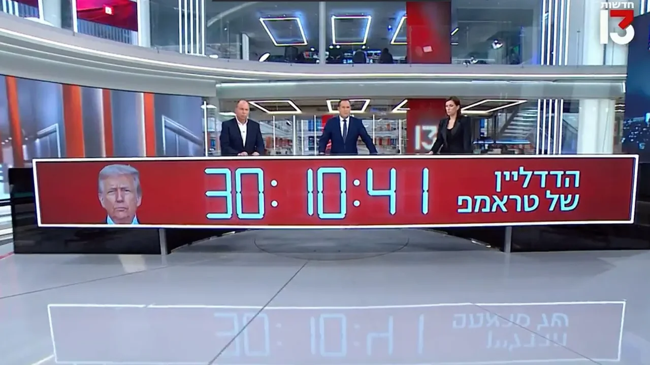 İsrail’de yayın yapan Kanal 13 televizyonu, stüdyo masasının önüne “Trump’ın tanıdığı son süre” ifadesiyle bir geri sayım sayacı koydu. Sayaç, ABD’nin İran’a verdiği sürenin dolmasına kalan zamanı göstermeye başladı.