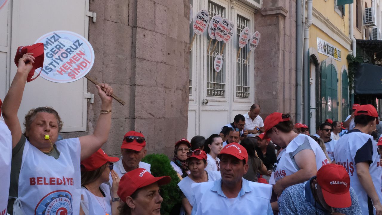 İzmir Büyükşehir Belediyesinden çıkarılan 360 işçinin işe geri dönme talebiyle başlattığı oturma eylemi 3. gününe girdi. Belediye-İş İzmir Şubeleriyle birlikte direnişi sürdüren işçiler, sabah saatlerinde yeniden Konak’taki Egemenlik Binası önünde toplandı.