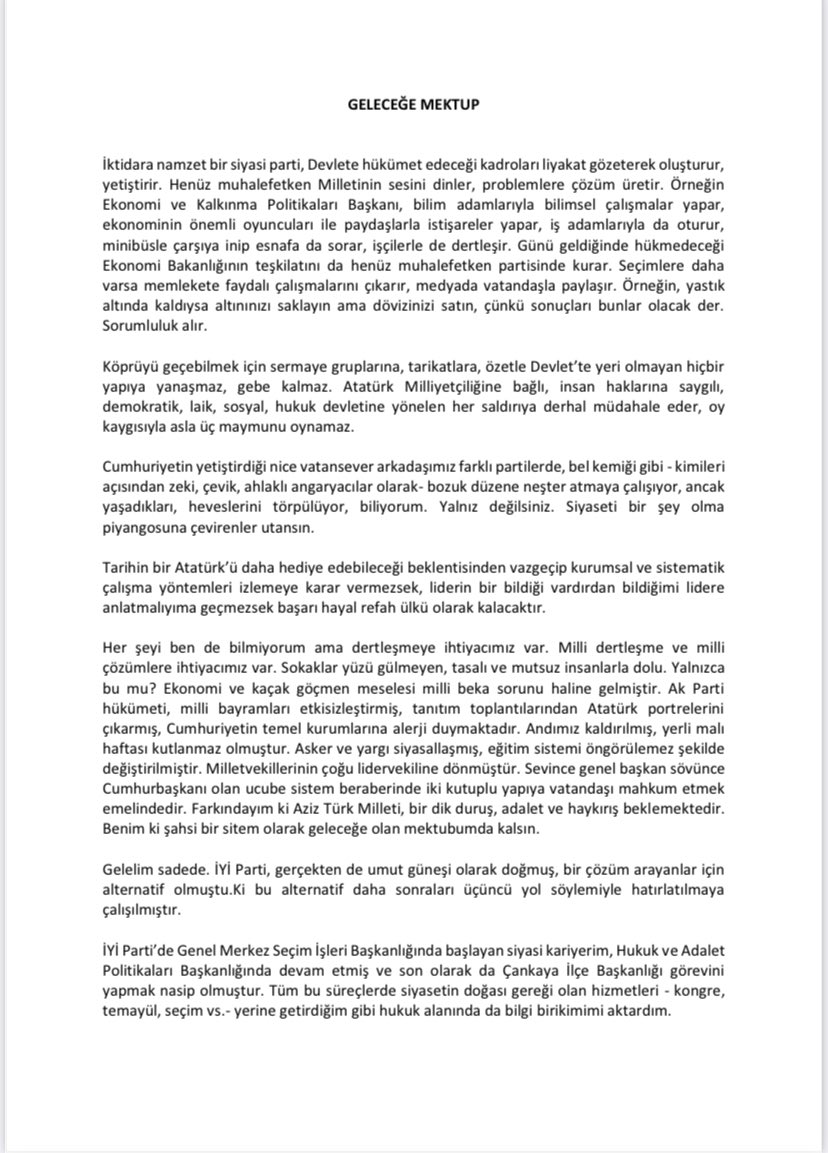 "Cesurlar hareketinin adsız kahramanlarına, teşkilatıma, İl Başkanımıza, yürekli tüm dava arkadaşlarıma teşekkür ediyor, İyi Parti Çankaya İlçe Başkanlığı görevimden ve İyi Parti üyeliğimden istifa ediyorum."