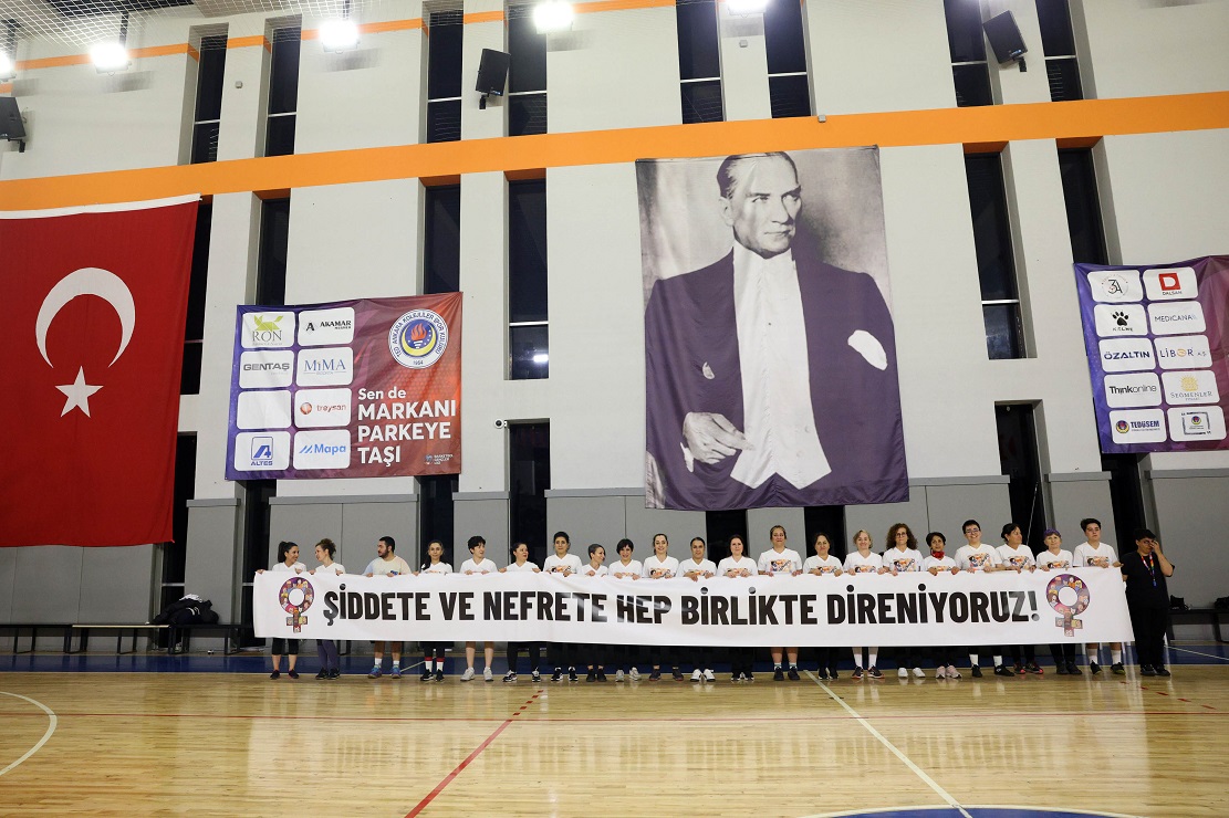 Dostluk maçında sahaya çıkan kadınlar, sporun eşitlikçi ve birleştirici yönüne dikkat çekti. Kadınların hayatın her alanında var olduğunu göstermek amacıyla parkeye çıkan sporcular, “Şiddete ve Nefrete Hep Birlikte Direniyoruz” pankartı ile güçlü bir mesaj verdi.