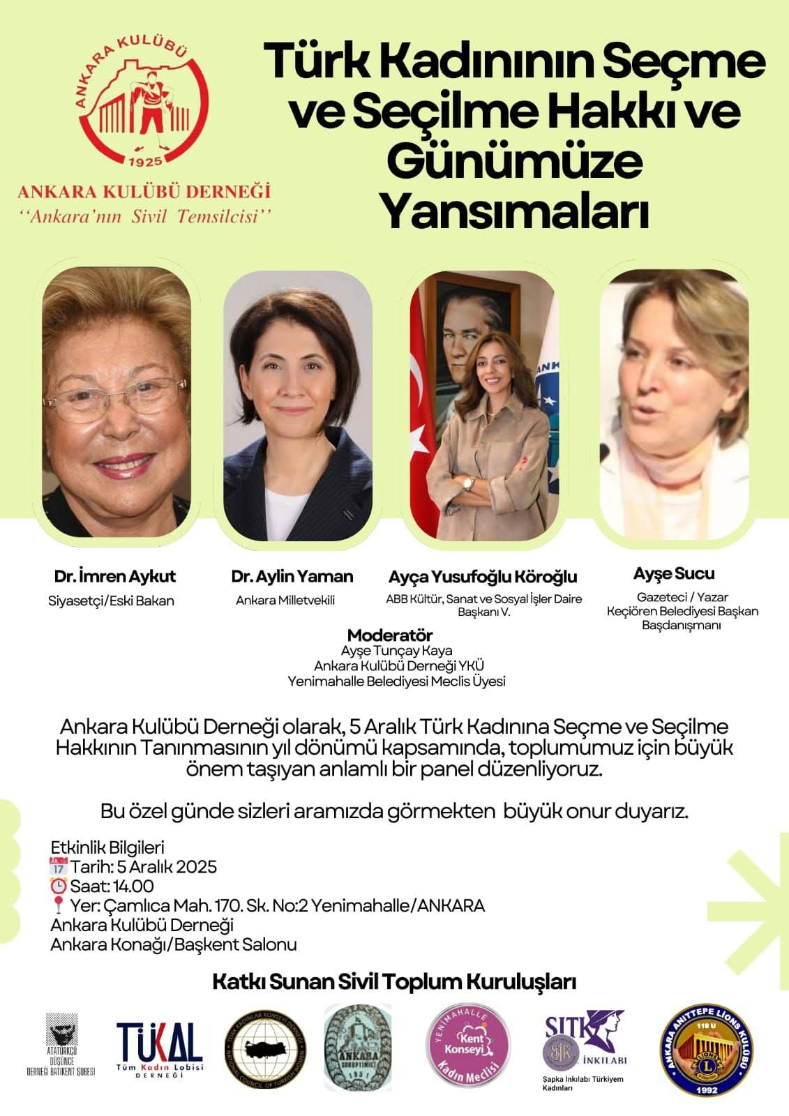 Türkiye’de kadınlara seçme ve seçilme hakkının tanınmasının yıldönümü kapsamında 5 Aralık’ta Ankara Konağı Başkent Salonu’nda panel gerçekleştirilecek. Cuma günü saat 14.00’te yapılacak etkinlik, çeşitli sivil toplum kuruluşlarının temsilcileri ile uzman konuşmacıları bir araya getirecek.