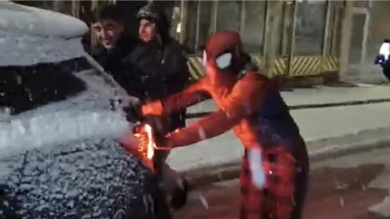 Bitlis’in Adilcevaz ilçesinde karla kaplanan yolda ilerlemekte güçlük çeken bir araç sürücüsünün yardımına, Türkiye'yi 'Örümcek Adam' kostümüyle gezen Ayaz Salih Koç (26) yetişti.