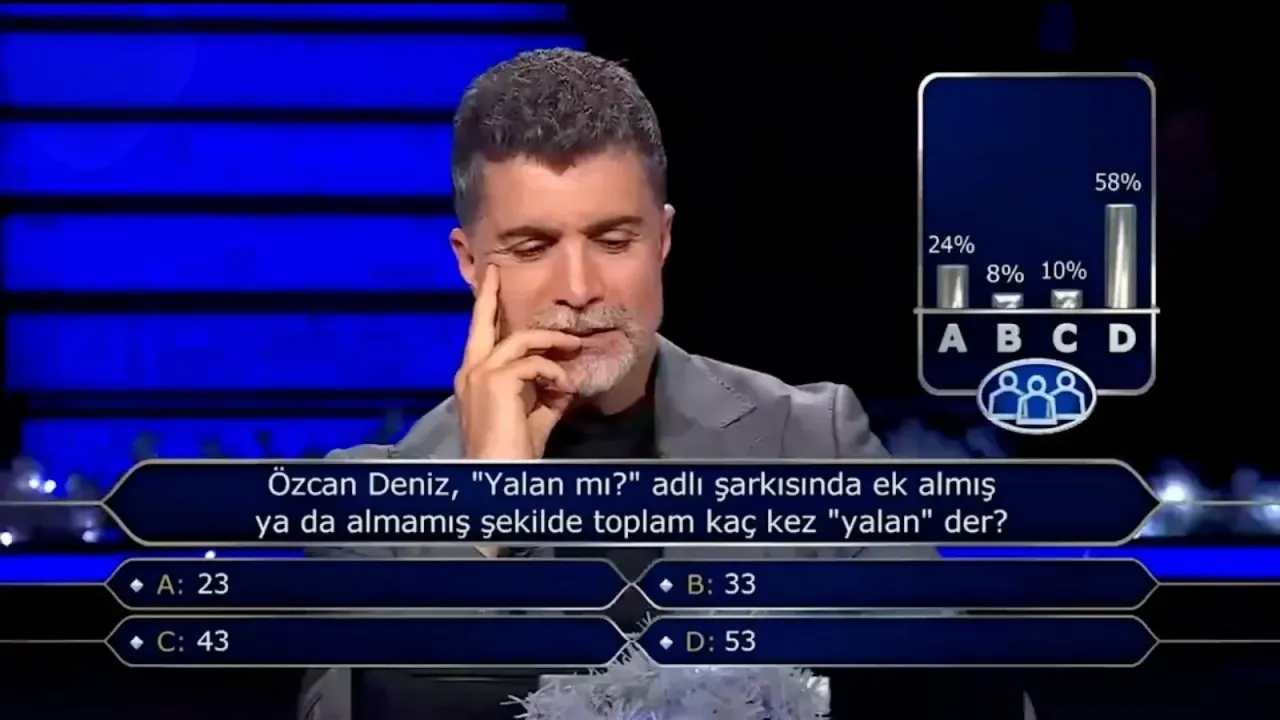 Yarışmanın 100 bin lira değerindeki sorusunda Özcan Deniz’e, 90’lı yıllara damga vuran “Yalan mı?” adlı şarkısında “yalan” kelimesinin ek almış ya da almamış hâliyle toplam kaç kez kullanıldığı soruldu. Deniz, soruyu yanıtlamadan önce şarkıyı mırıldanarak saymaya çalıştı.
