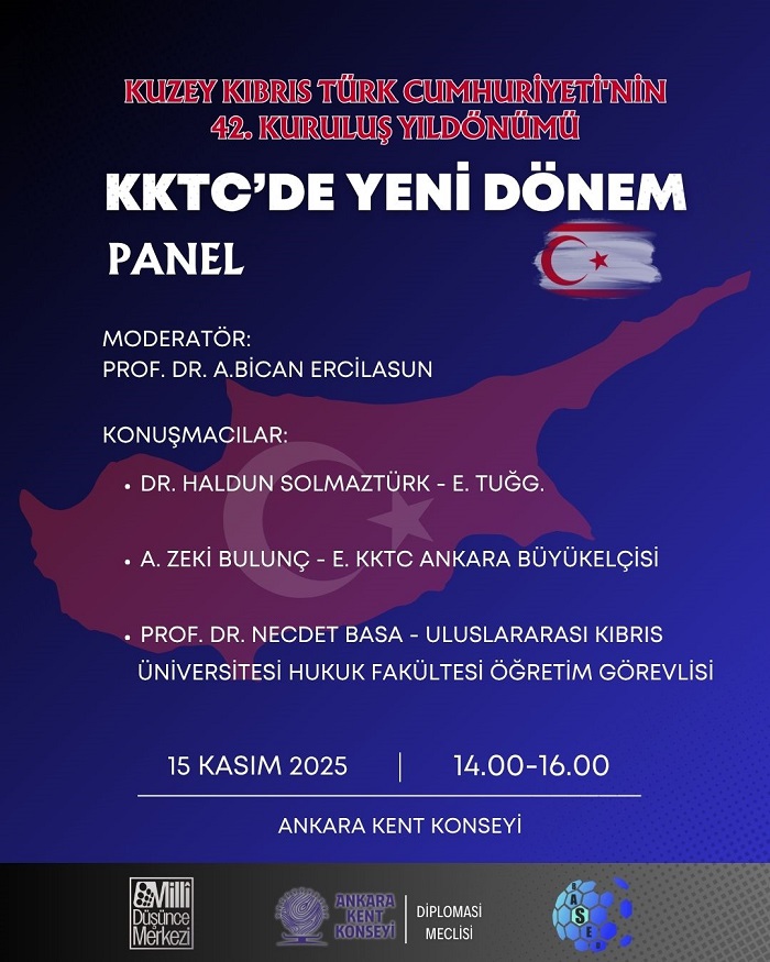 Kuzey Kıbrıs Türk Cumhuriyeti’nin 42. kuruluş yıldönümü kapsamında anlamlı bir etkinlik Ankara’da düzenleniyor. “KKTC’de Yeni Dönem” başlıklı panel, yarın saat 14.00-16.00 arasında Ankara Kent Konseyi ev sahipliğinde, Ankara Kent Konseyi Diploması Meclisi ev sahipliğinde, Milli Düşünce Merkezi ve BASE iştirakiyle yapılacak.
