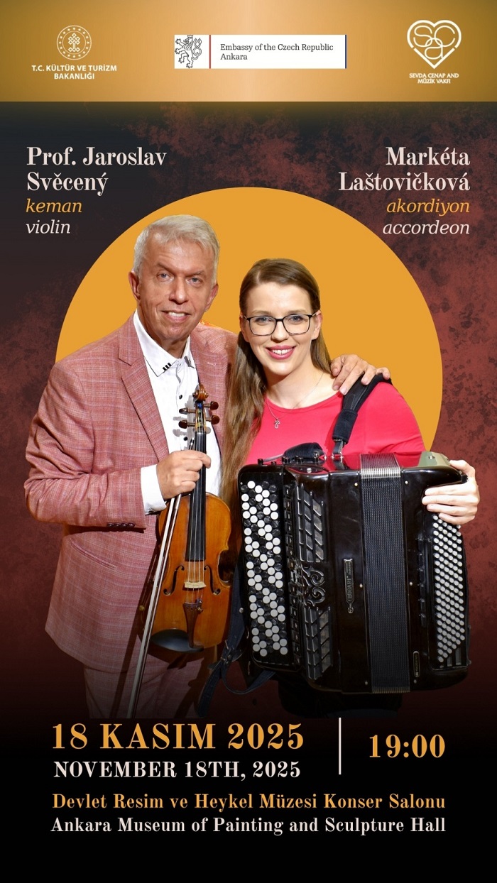 Çek Cumhuriyeti Ankara Büyükelçiliği ve Sevda-Cenap And Müzik Vakfı işbirliğinde, Kültür ve Turizm Bakanlığı desteğiyle düzenlenen Latin Melodileri ve Ritimleri Gala Konseri, Ankara’da müzikseverlerle buluşacak. Çekya’nın önde gelen keman sanatçılarından Prof. Jaroslav Svěcený ile akordeon sanatçısı Markéta Laštovičková’nın yer alacağı konser, 18 Kasım 2025 Salı günü saat 19.00’da Resim Heykel Müzesi Konser Salonu’nda gerçekleşecek.