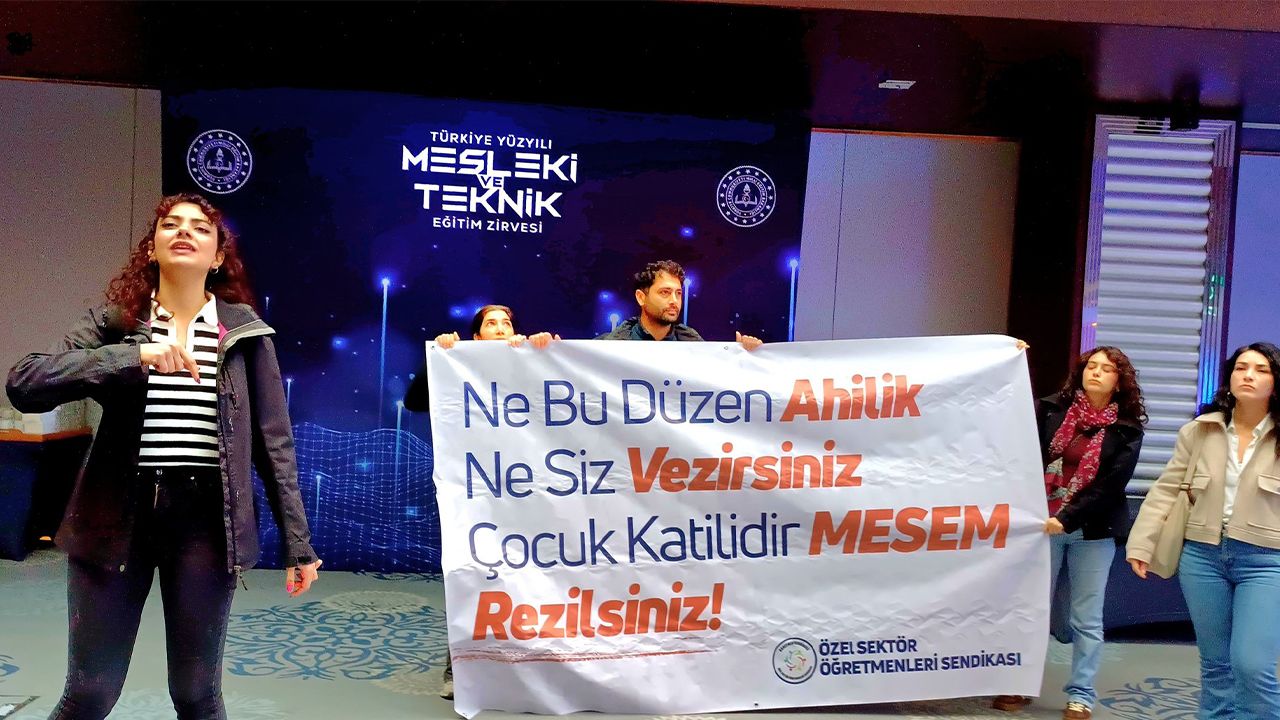 Özel Sektör Öğretmenleri Sendikası, Milli Eğitim Bakanlığı’nın İstanbul'da düzenlediği, Mesleki Eğitim Zirvesi'nde Mesleki Eğitim Merkezleri'nde (MESEM) çalıştırılan çocukların iş cinayetlerinde yaşamını yitirmesini protesto etti.