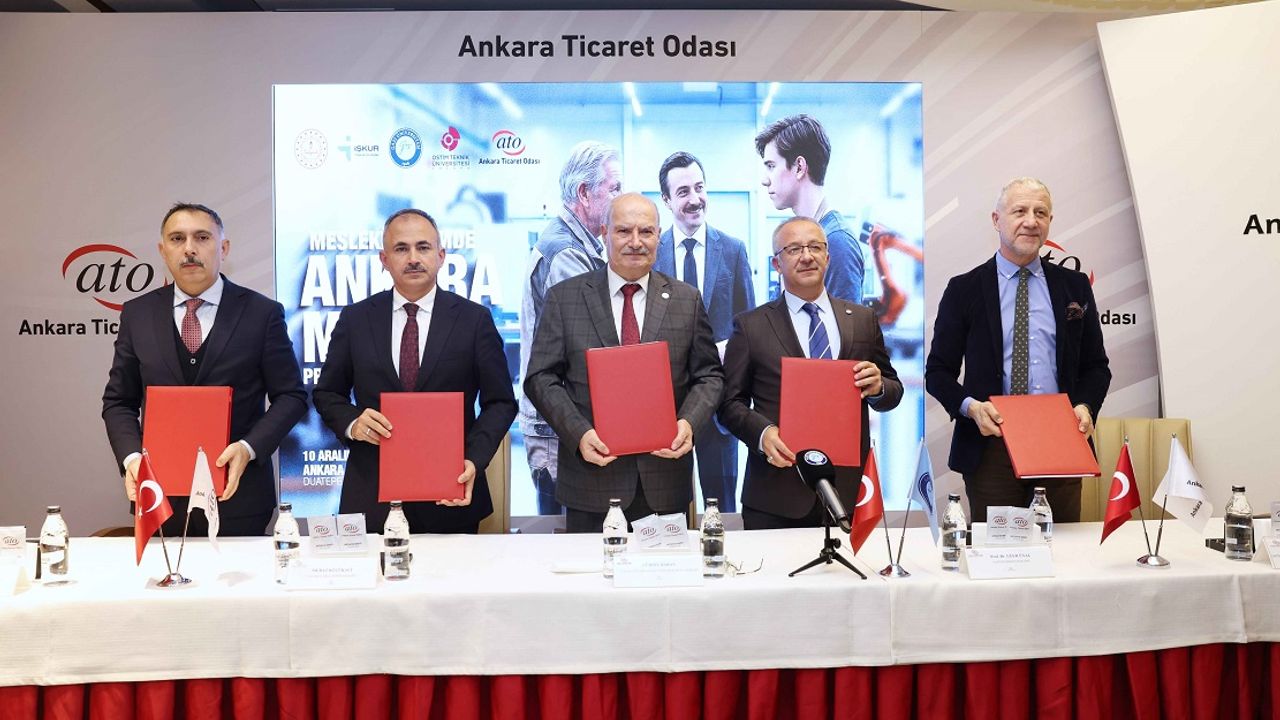 Ankara Ticaret Odası (ATO), Ankara İl Milli Eğitim Müdürlüğü, Ankara İŞKUR, Gazi Üniversitesi ve OSTİM Teknik Üniversitesi arasında hayata geçirilen “Mesleki Eğitimde Ankara Modeli Protokolü”, ATO Duatepe Salonu’nda düzenlenen törenle imzalandı. Protokolle, Ankara’da nitelikli insan gücü yetiştirilmesi, eğitim ile sanayi arasındaki uyumun artırılması ve iş dünyasının ihtiyaç duyduğu teknik personelin yetiştirilmesi hedefleniyor.