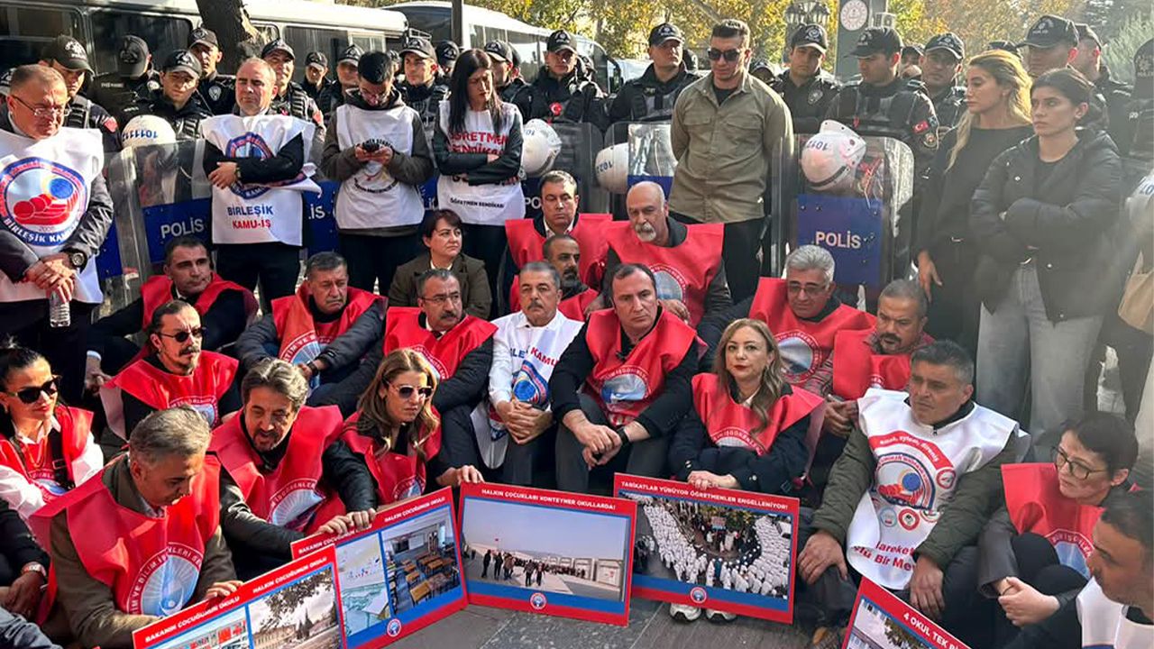 Polisler bakanlığın önünü barikatlarla kapattı. Eğitim-İş, eylem için polisle görüşmelerini sürdürüyor. Üyeler görüşmeler sürerken, "Direne direne kazanacağız", "Öğretmene değil, tarikata barikat" sloganları attı.