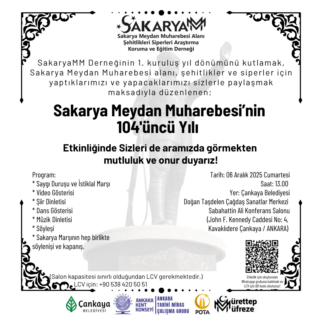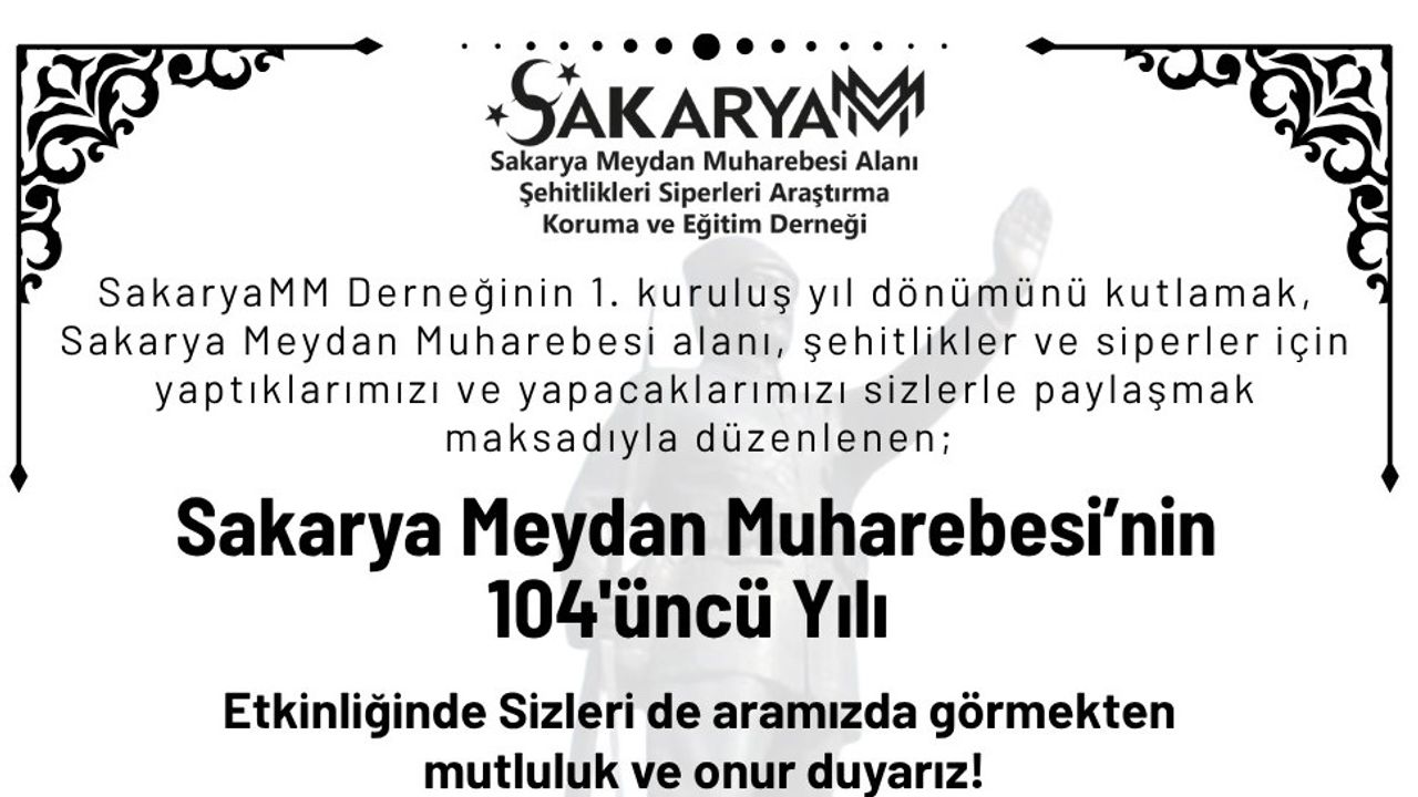 Ankara Kent Konseyi Tarihi Miras Çalışma Grubu ile SakaryaMM Derneği iş birliğiyle, derneğin 1’inci kuruluş yıl dönümü kapsamında “Sakarya Meydan Muharebesinin 104’üncü Yılı” etkinliği gerçekleştirilecek.