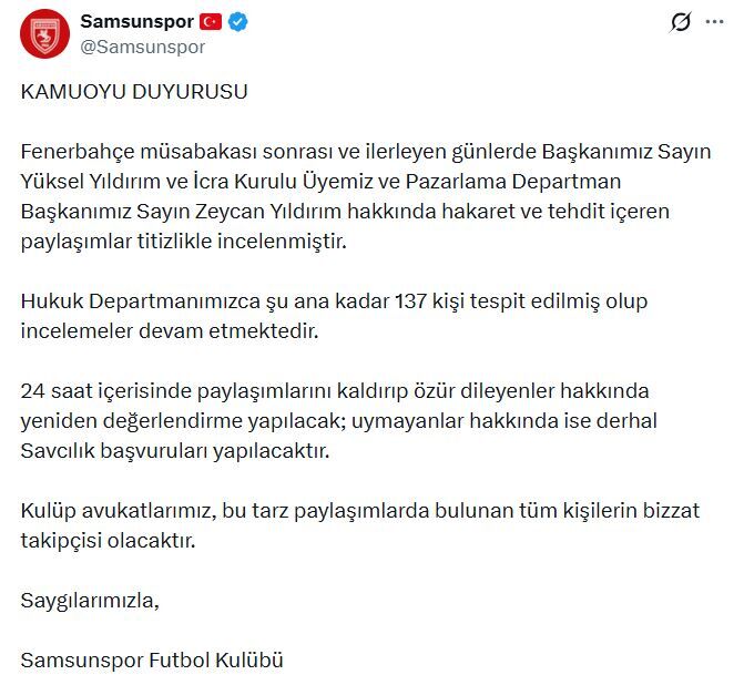 Samsunspor Kulübü, Fenerbahçe maçı sonrası Başkan Yüksel Yıldırım ve İcra Kurulu Üyesi Zeycan Yıldırım’a yönelik sanal medya üzerinden yapılan hakaret ve tehdit içerikli paylaşımlar hakkında 137 kişinin tespit edildiğini ve 24 saat içinde özür dilenmemesi halinde yasal süreç başlatılacağını duyurdu.