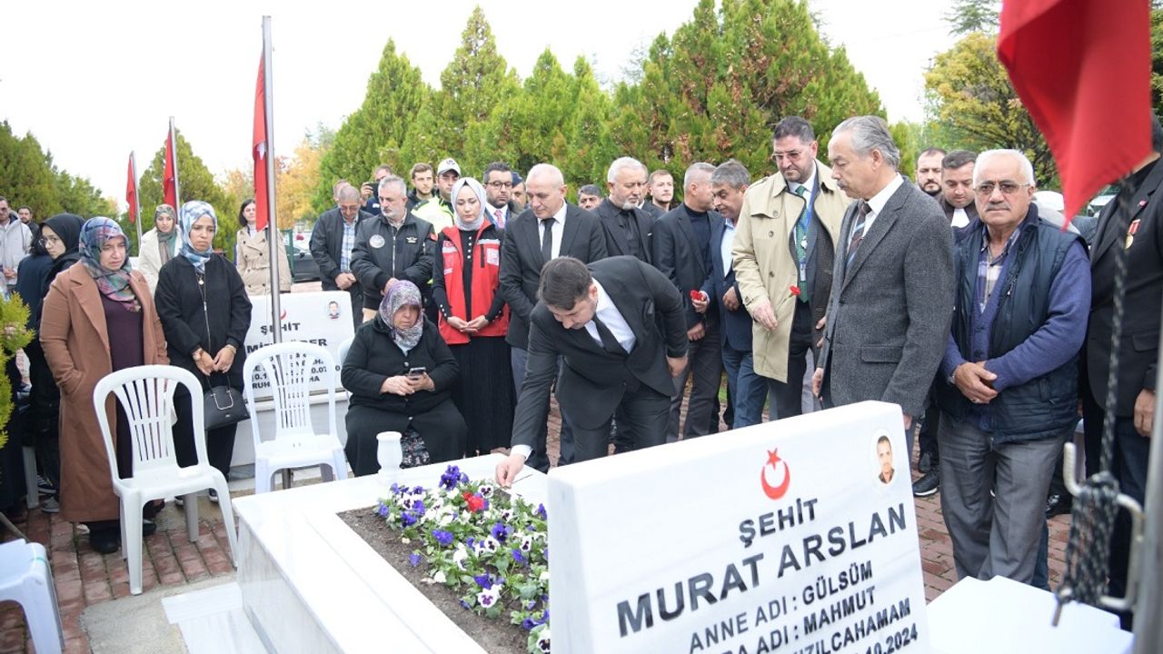 Ziyaretin ardından Kahramankazan Kaymakamı Abdullah Selim Parlar, İlçe Müftüsü Abdullah Yalman, siyasi parti temsilcileri, şehit yakınları ve vatandaşlarla birlikte şehitliğe giden Başkan Çırpanoğlu, Murat Aslan’ın kabrine çiçek bırakarak dua etti.