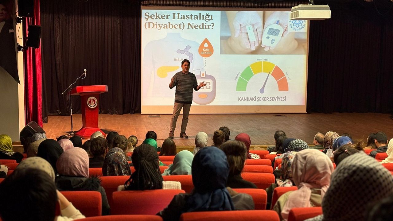 Lale Konferans Salonu’nda düzenlenen farkındalık semineri, Dahiliye Uzmanı Doç. Dr. Kadir Serkan Yalçın ve Göğüs Hastalıkları Uzmanı Dr. Hüseyin Koşak’ın sunumlarıyla gerçekleştirildi. Programın ilk bölümünde Doç. Dr. Yalçın, diyabet hastalığının belirtileri, tanı yöntemleri ve güncel tedavi tekniklerini ele aldı. Doğru beslenme ve düzenli fiziksel aktivitenin hayati önem taşıdığını vurgulayan Yalçın, diyabetin yaşam kalitesi üzerindeki etkileri ve hastalığın kontrol altında tutulmasına yönelik uygulanabilecek yöntemler hakkında katılımcılara detaylı bilgiler verdi.