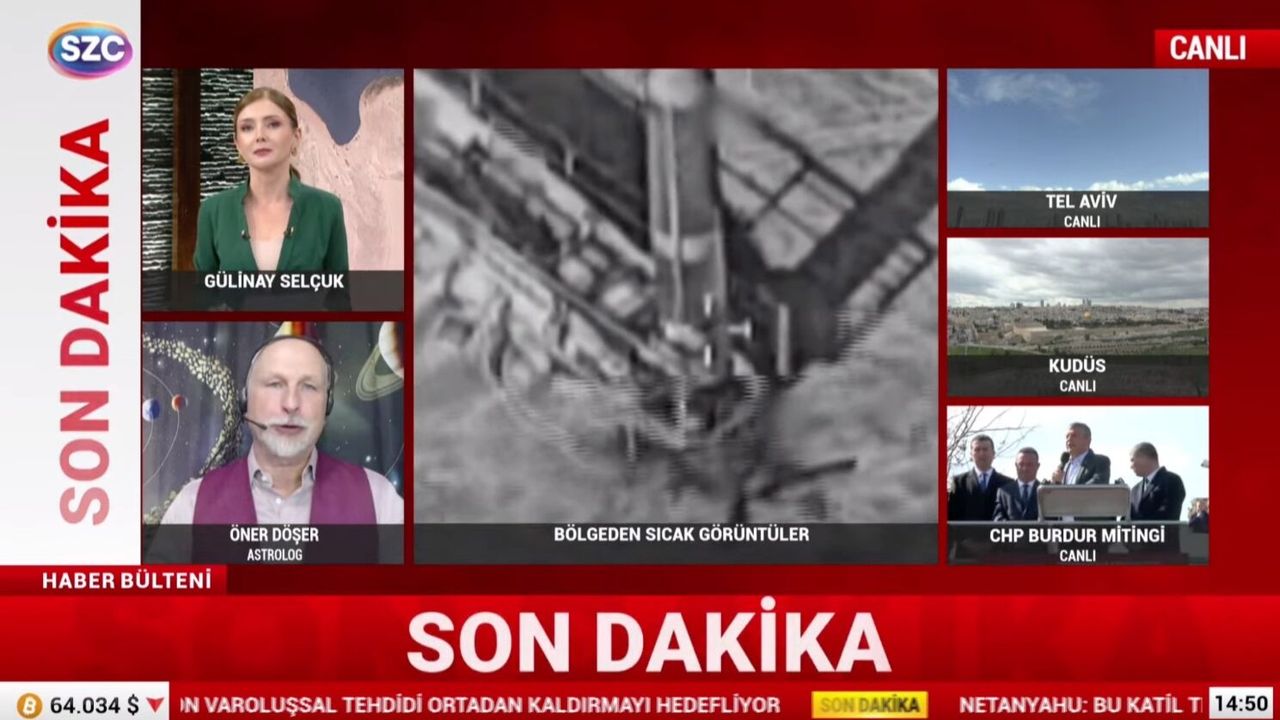 Saldırı haberleri ve bölgeden gelen görüntüler, Sözcü TV’de yayınlanan ana haber bülteninde izleyicilere aktarıldı. Gülinay Selçuk’un sunduğu programda, saldırıların bölgesel ve küresel etkileri ele alınırken canlı yayına astrolog Öner Döşer konuk edildi.
