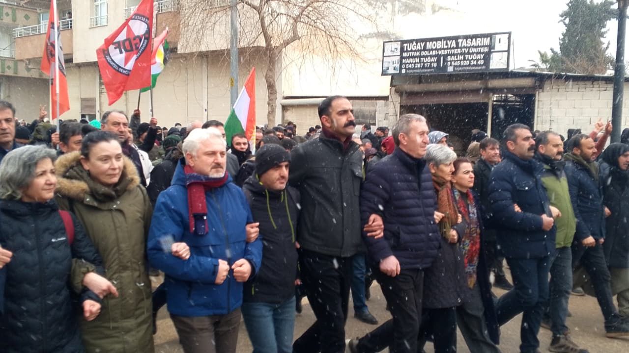 DEM Parti öncülüğündeki Demokratik Kurumlar Platformu, Şanlıurfa'nın Suruç ilçesinde HTŞ öncülüğünde kurulan Şam yönetiminin Suriye Demokratik Güçleri'nin (SDG) kontrolündeki bölgelere saldırmasını protesto ediyor.